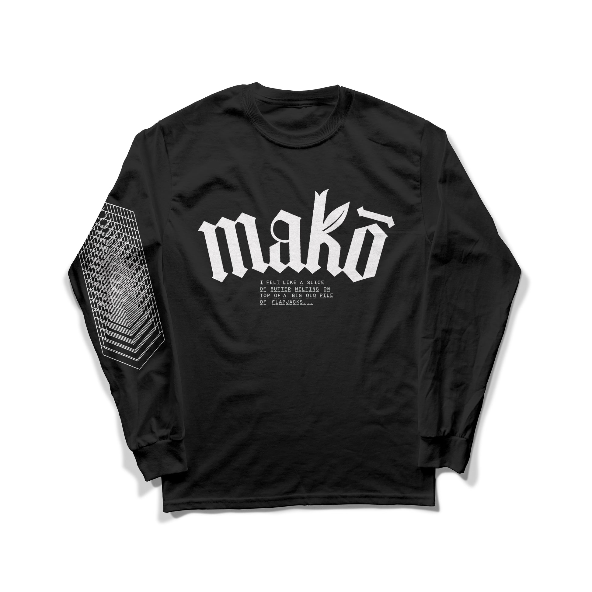 This isn’t just a shirt, it’s a state of mind. Front and center you’ve got the bold Mako logo, backed up by one of the most quotable lines from Pineapple Express: “I felt like a slice of butter melting on top of a big old pile of flapjacks.” Slip this on and suddenly you’re not just chilling, you’re the main character in a stoner comedy. The sleeve flexes a trippy geometric design that’ll have strangers asking if you “know a guy” (spoiler: you do). Soft, comfy, and dangerously good at sparking conversations you may or may not remember later.