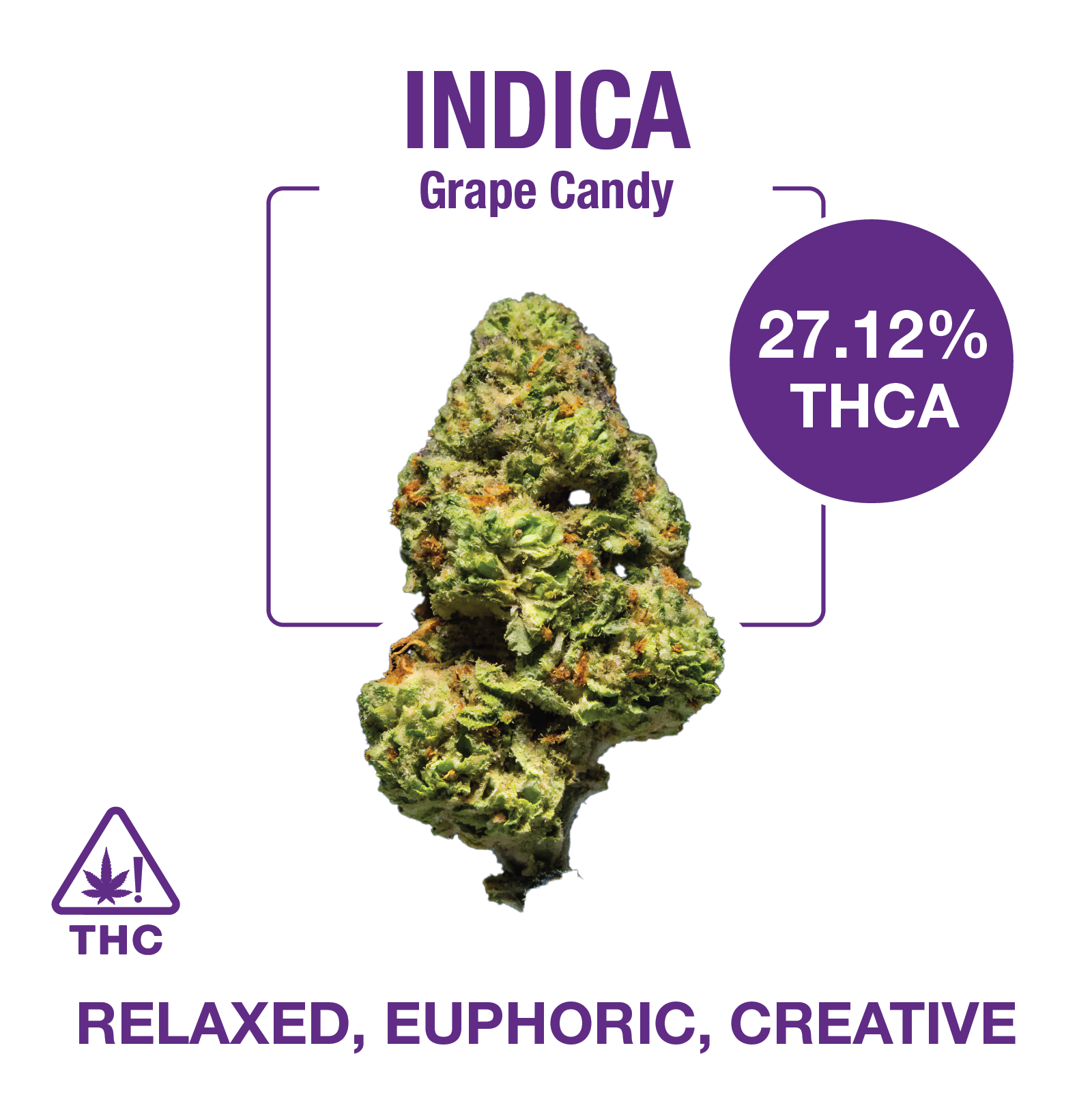 This indica strain brings juicy grape, creamy berry, and a touch of citrus zest to your palate, all wrapped in a sugary candy finish. The high begins with a warm, uplifting rush, then slowly deepens into a soothing body melt ideal for couch-surfing into bliss. Great for unwinding after a long day, turning on mellow tunes, or just staring off into space and pretending you’re in a grape orchard.